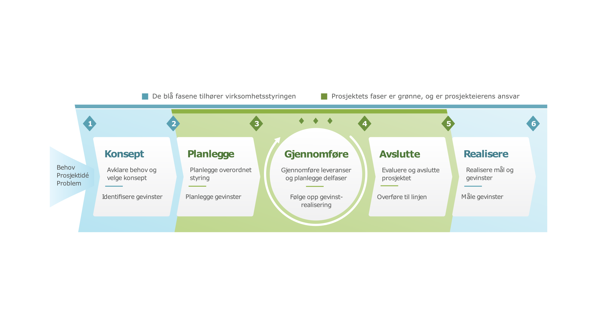 Prosjektets faser er grønne, og er prosjekteierens ansvar